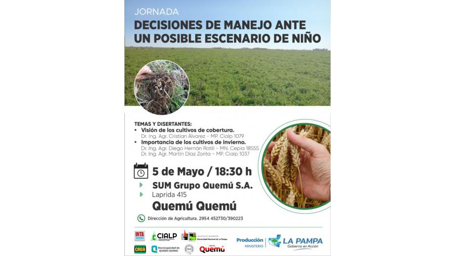Bajo el título “Decisiones de manejo ante un posible escenario de Niño”, se brindarán herramientas técnicas para productores y asesores en Quemú Quemú.