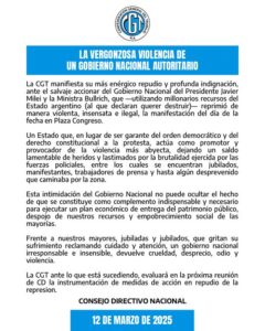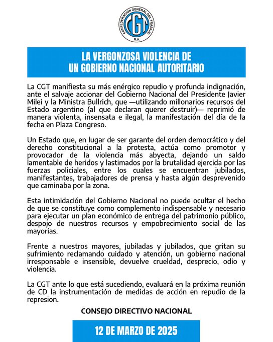 La CGT manifestó el miércoles su «más enérgico repudio y profunda indignación ante el salvaje accionar del Gobierno de Javier Milei y la ministra de Seguridad, Patricia Bullrich, que utilizando millonarios recursos del Estado argentino reprimió de manera violenta, insensata e ilegal la manifestación en Plaza Congreso», expresó la organización ayer en un comunicado.