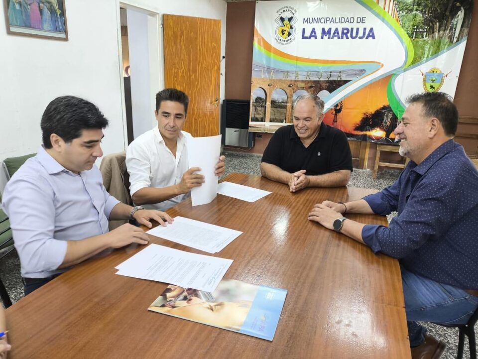 El ministro de Obras y Servicios Públicos, Alfredo Intronati, acompañado por el ministro de Gobierno y Asuntos Municipales, Pascual Fernández y el administrador de la APA, Fabricio González Martín, visitó la localidad de La Maruja donde se reunieron con el intendente Gustavo Cein para firmar un nuevo convenio del Programa de Agua y Saneamiento que favorecerá a la comunidad a reforzar el abastecimiento de agua potable a los vecinos.