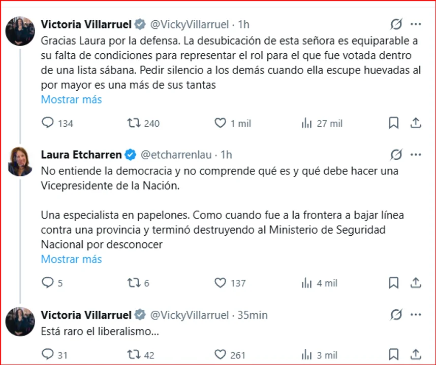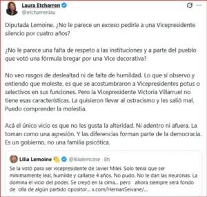 Lejos de evitar la confrontación, Villarruel respondió con dureza a los cuestionamientos y salió al cruce de la legisladora libertaria. En uno de sus mensajes, agradeció el respaldo de la analista Laura Etcharren y apuntó directamente contra Lemoine: